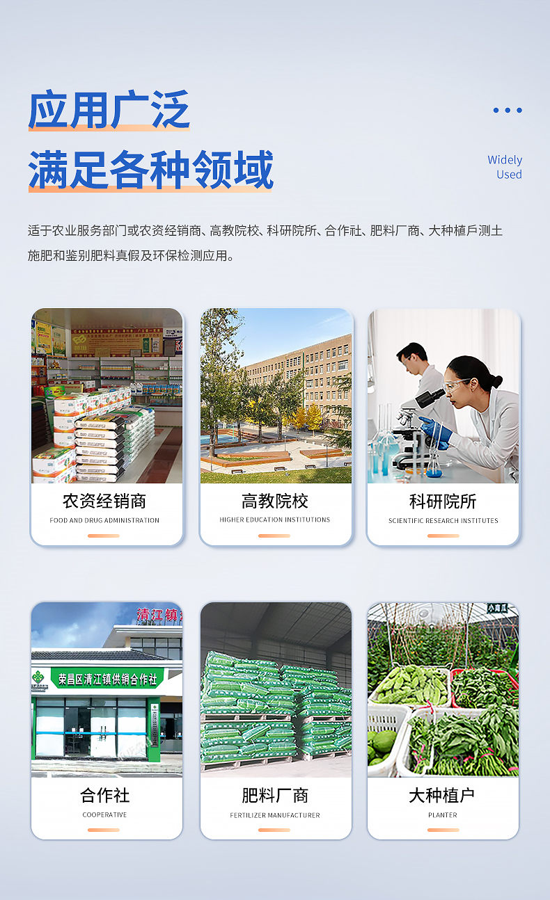 配套齊全:該儀器集藥、器、儀為一體,攜帶方便,相當(dāng)于一個(gè)小型移動實(shí)驗(yàn)室,無需用戶自配附件,亦可靈活野外流動測試。適于農(nóng)業(yè)服務(wù)部門或農(nóng)資經(jīng)銷商、高教院校、科研院所、合作社、肥料廠商、大種植戶測土施肥和鑒別肥料真假及環(huán)保檢測應(yīng)用。