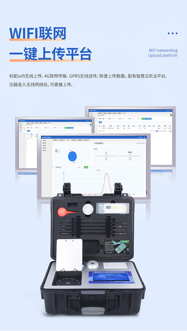 10、配有智慧云農(nóng)業(yè)平臺,儀器連入無線網(wǎng)絡(luò)后,可將檢測數(shù)據(jù)可選擇性或批量無線上傳,方便用戶進(jìn)行數(shù)據(jù)管理和長期分析。