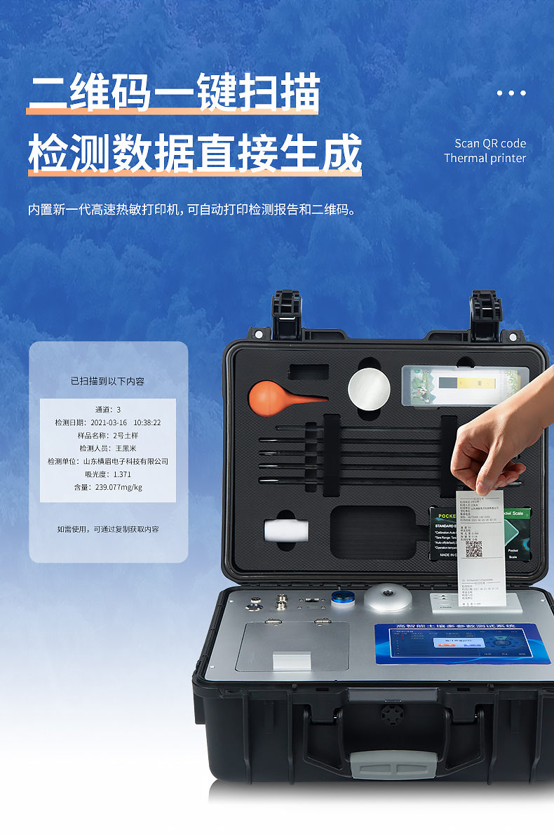 18、內(nèi)置新一代高速熱敏打印機(jī)(無需色帶),打印內(nèi)容包含:檢測單位、檢測人員、檢測項(xiàng)目、通道號、吸光度、養(yǎng)分含量(mg/kg)、檢測時(shí)間、以及二維碼等信息