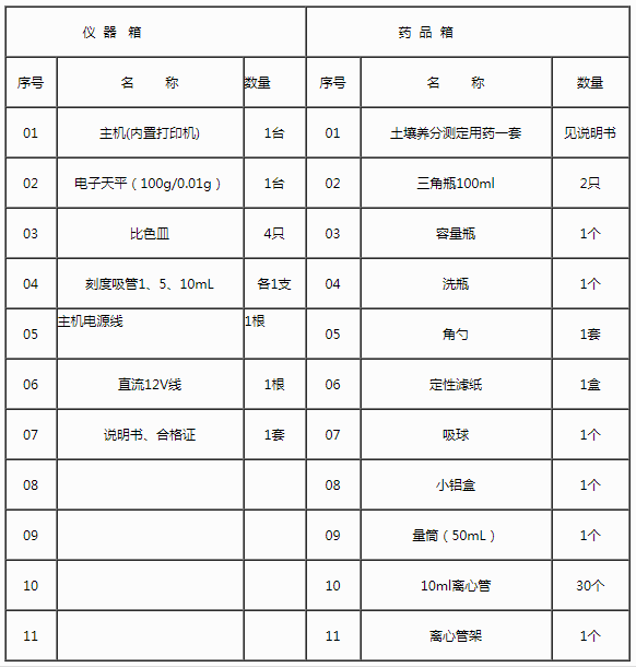 配套齊全:該儀器集藥、器、儀為一體,攜帶方便,相當(dāng)于一個(gè)小型實(shí)驗(yàn)室。適于農(nóng)業(yè)服務(wù)部門或農(nóng)資經(jīng)銷商、肥料廠商測(cè)土施肥和鑒別肥料真假。