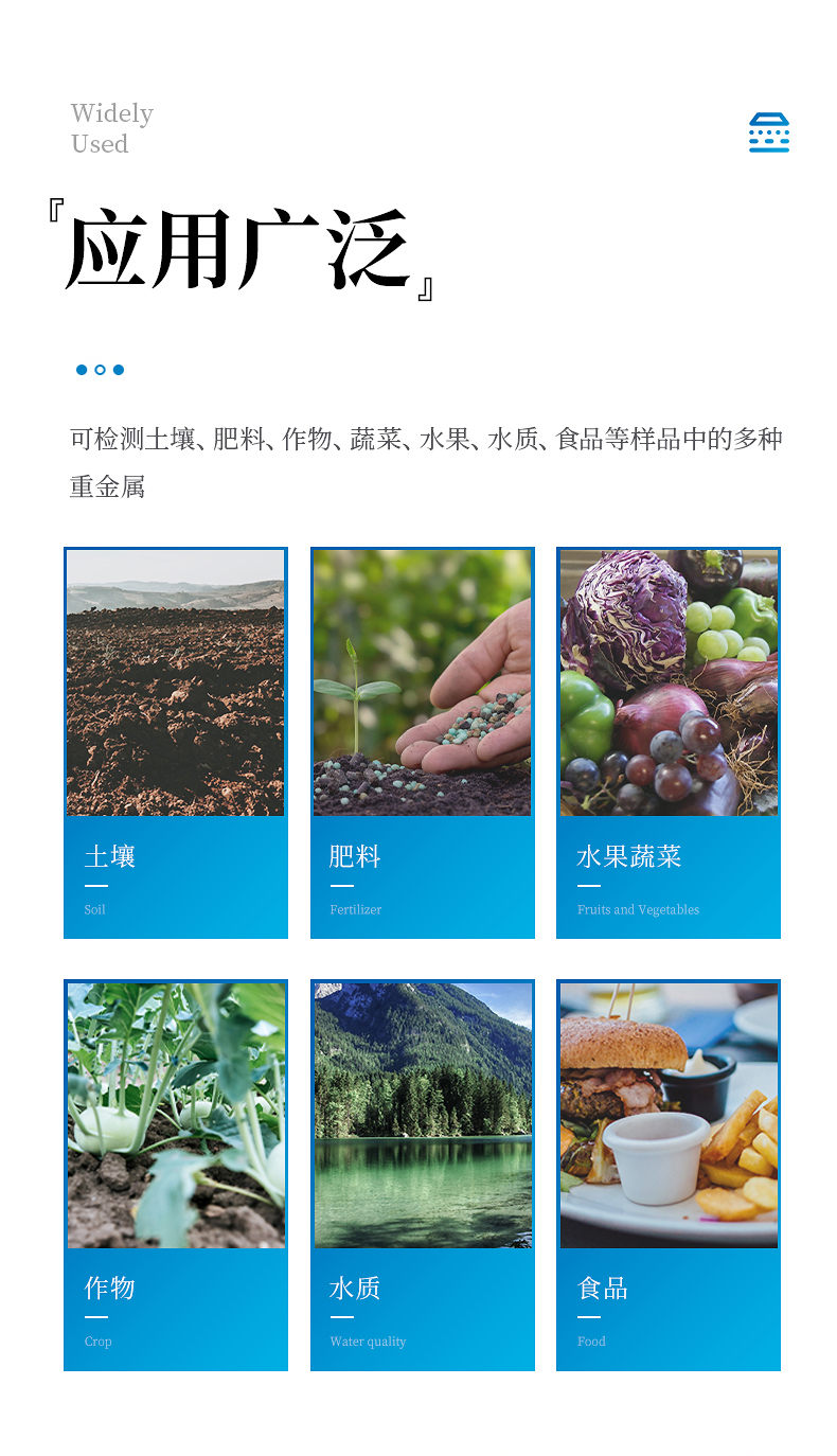 可對土壤、肥料、作物、蔬菜、水果、水質(zhì)、食品等樣品中的砷、鉛、鎘、鉻、汞、鎳、鋁、氟、鈦、硒、鐵、鋅、錳、銅等進(jìn)行快速聯(lián)合測定。
