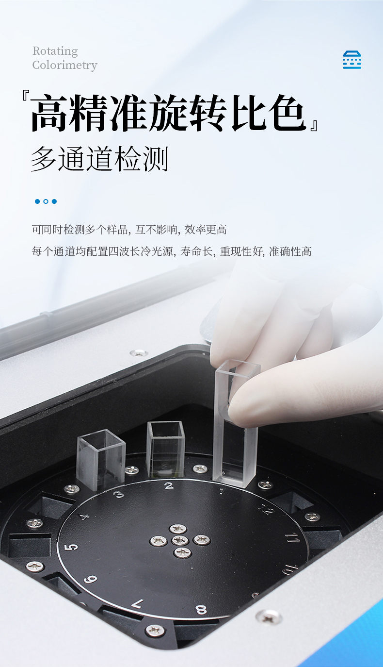 2、采用精密旋轉(zhuǎn)比色池設(shè)計,光源一致性更加**,保證檢測精度。